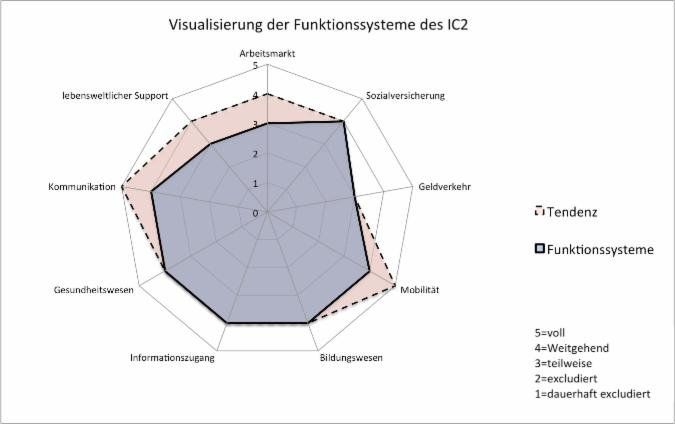 Die Visualisierung des Inklusions Chart stellt einen weitern Schritt in der Datenreduktion dar. Die Darstellung des Inkludierungsgrad in einem Spinnennetzdiagramm haben wir primär als Kommunikationstool entwickelt. Die Visualisierung des Inklusion Chart erleichtert die Kommunikation mit dem Klienten aber auch mit anderen Professionen. Da wir das Instrument periodisch verwenden, können hier Änderungen im Inkludierungsgrad während eines bestimmten Zeitraums leicht visualisiert und dadurch veranschaulicht werden.